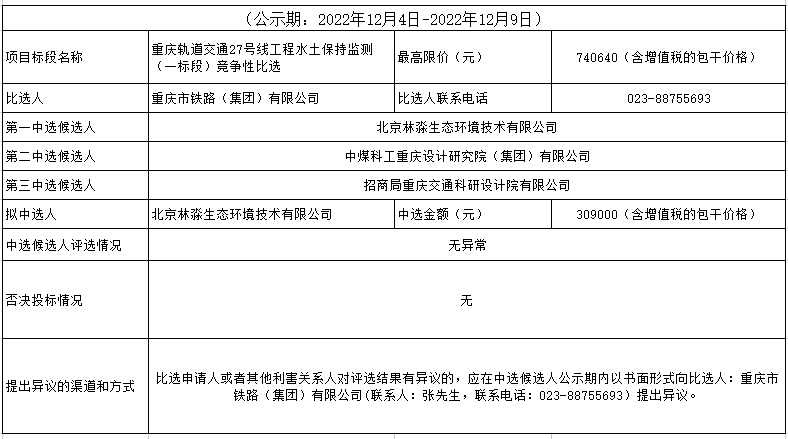 重慶軌道交通27號線工程水土保持監測(一標段)競爭性比選結果公示表