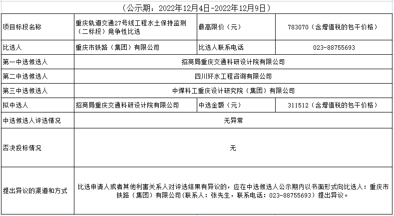 重慶軌道交通27號線工程水土保持監測(二標段)競爭性比選結果公示表