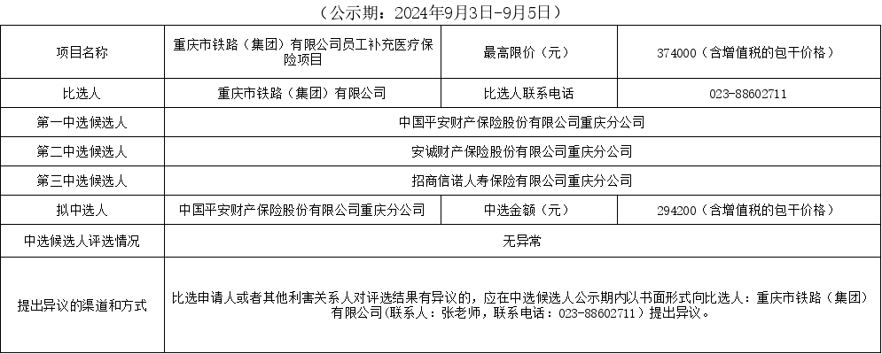 重慶市鐵路(集團)有限公司員工補充醫療保險項目競爭性比選結果公示表