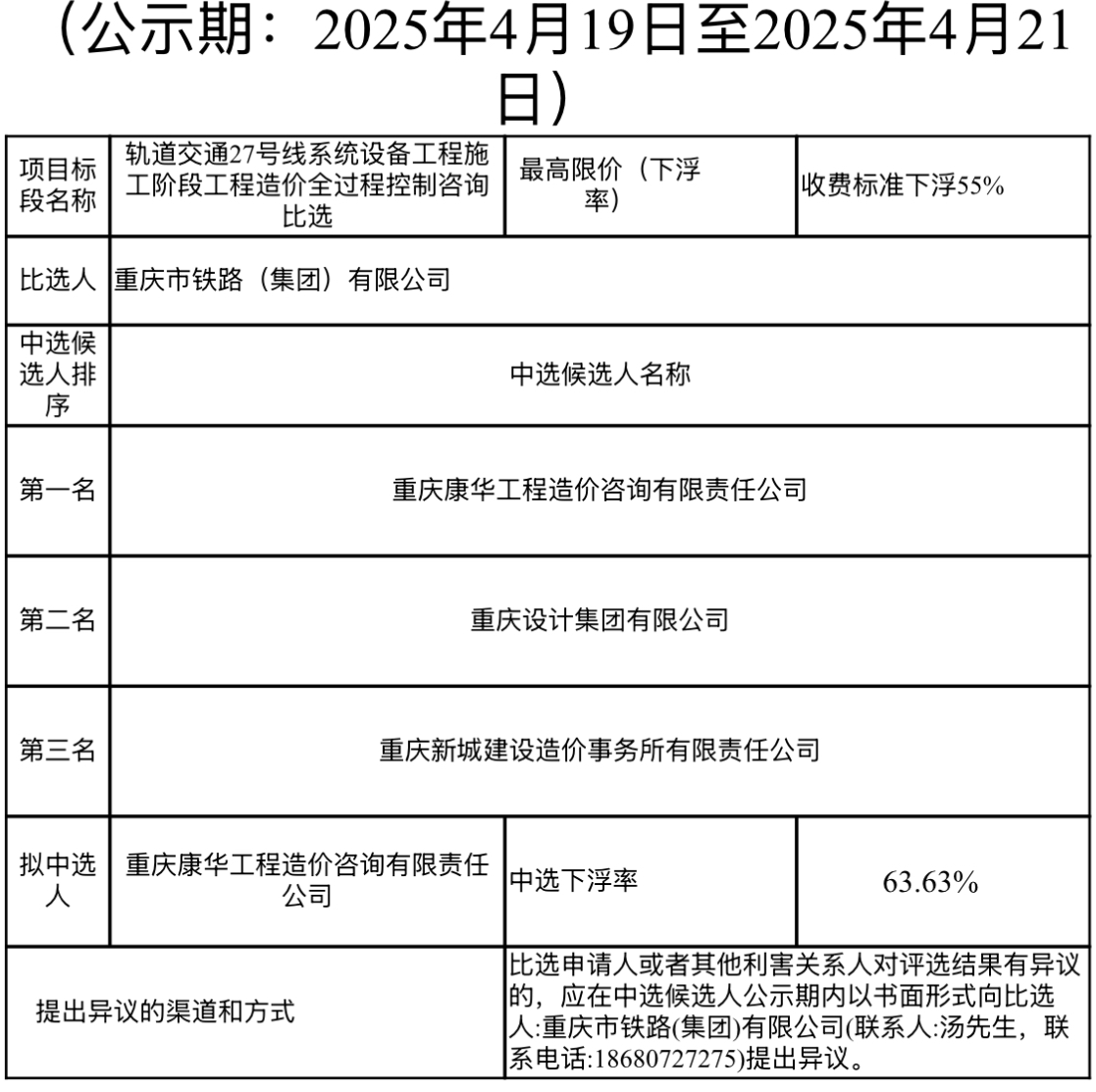 軌道交通27號線系統(tǒng)設(shè)備工程施工階段工程造價(jià)全過程控制咨詢比選結(jié)果公示