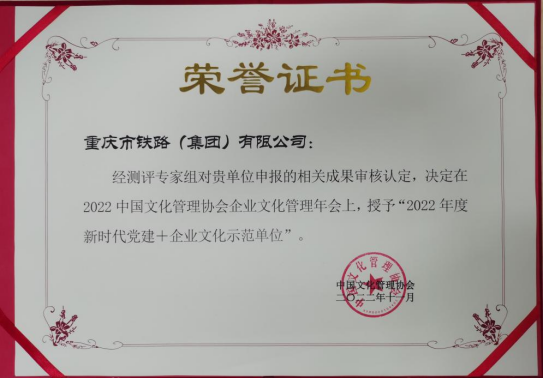 近期,在北京舉辦的中國文化管理協(xié)會企業(yè)文化管理年會上,經(jīng)專家評選,重慶市鐵路集團(tuán)榮獲2022年度“新時代黨建+企業(yè)文化示范單位”榮譽稱號,集團(tuán)黨建引領(lǐng)高質(zhì)量發(fā)展再上新臺階。
