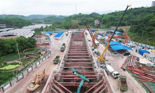 根據設計資料顯示,15號線二期中梁山隧道正線下穿5組既有線,其中安全風險最高為下穿渭井下行線,拱頂埋深距離既有線鋼軌頂僅8.61米,周邊環境復雜,施工風險極高。為保障中梁山隧道施工期間既有線安全運營,根據鐵路監管部門要求,設計采用D16型施工便梁對下穿范圍內線路進行加固。該加固施工于2023年12月完成樁基礎施工,2024年4月開始籌備架梁工作,至5月16日凌晨完成全部架設任務,安全恢復列車通行。