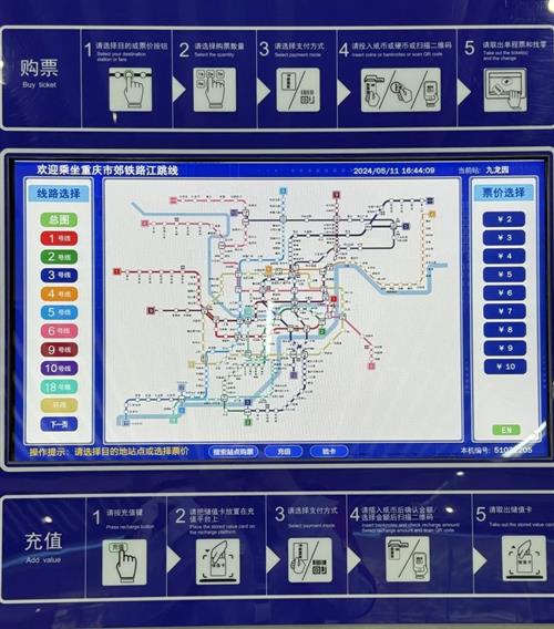 TVM,全稱叫做“自動售票機”。TVM最下方的第一個選項為“搜索站點購票”,輸入站點首字母即可快速鎖定目的站點,(例如:目的站點為“小什字”即輸入XSZ)。第二個選項為“充值”,選擇現金、微信、支付寶進行支付。第三個選項是“驗卡”,可以快速查詢卡內余額。主屏幕上還呈現有重慶市完整的軌道交通線路圖,可縮小放大,便于大家更好地規劃出行路線。